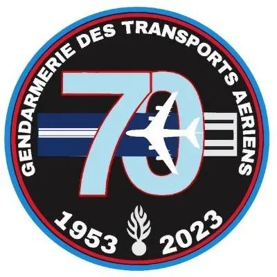 En périphérie, l’inscription "GENDARMERIE DES TRANSPORTS AÉRIENS" souligne l’identité de l’institution, tandis que les dates 1953 et 2023 marquent sept décennies de service et de protection. En bas, la grenade emblématique de la Gendarmerie vient ancrer l’ensemble dans sa tradition.